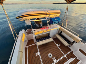 As we worked the boat through its paces, I was impressed by how quiet it was. With doors and windows closed in sweetspot mode, I measured only 78 decibels—about the noise level of a washing machine or busy dishwasher. That number only went up to 85 decibels with everything open and the outboard at full cry.