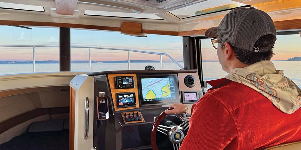 Soon, I hopped on the helm, and gave the R-25 a thorough run. Especially in the protected flat water, the boat thrived. So smooth, so easy to drive, so effortless to get up on plane, so fun to turn and maneuver. Going through our own wake reinforced the notion that most folks won’t be happy bashing into steep chop on the R-25, but as I regained the efficient, planing sweetspot and set the autopilot, I suggested, “Friday Harbor? We can be there in 2.5 hours!”