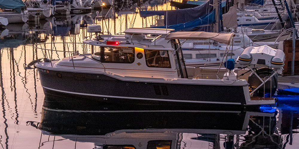 I learned from Dennis about the tradition of modifying and upgrading these little boats, guided in part by the very enthusiastic and invested community of other Ranger Tugs owners. He had high praise for his boat’s previous owner, who had invested in upgrades like an extra solar panel and a lithium battery with even more capacity than the R-25’s standard LiFePO4 battery, as well as the factory option of the dinghy lift system designed and built by Ranger Tugs, which is raised and lowered by a removable block and tackle. As for other upgrades, Dennis is eyeing a different propeller, a full cockpit enclosure, and is still evaluating whether the auto-trim tabs are right for him and his use-case. He’s already leveled up the sound system, too.