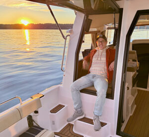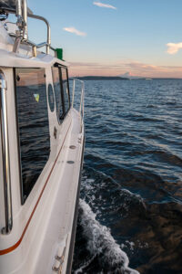 Soon, I hopped on the helm, and gave the R-25 a thorough run. Especially in the protected flat water, the boat thrived. So smooth, so easy to drive, so effortless to get up on plane, so fun to turn and maneuver. Going through our own wake reinforced the notion that most folks won’t be happy bashing into steep chop on the R-25, but as I regained the efficient, planing sweetspot and set the autopilot, I suggested, “Friday Harbor? We can be there in 2.5 hours!”