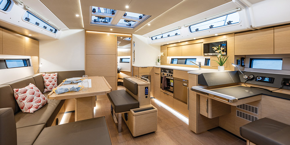 I liked the stand-alone bench as a seating component across from the saloon table’s C-shaped settee—it allows much more ergonomic access to the seating area. I also appreciated this 460’s choice of a true navigation station, always good for actual navigation, but in my experience, it’s also the most frequently used seat on any cruising boat, period. In all, I found the interior to be luxuriously spacious and inviting for a boat of this size, with modern styling and thoughtful details to go with user-friendly technology employed throughout—from layout, to lighting, to appliances.