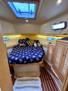 Sail tweaker that I am, I wanted to play with many elements of the set-up, but I didn’t find a lot of gold to mine in the fullest upwind mode. Moreover, sail adjustments producing heel of more than 15 degrees was a quality of life reduction in the cabin that spans nearly the boat’s full 13-foot beam.
