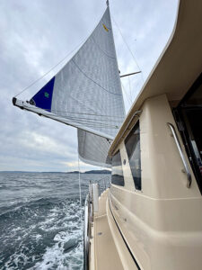 We were ready to put the boat through its paces under sail. Like a lot of sailing purists, I neither expected, nor expected to like, the single push-button system in the pilothouse that unfurled the main. Pretty slick! On days when you’re traveling through a lot of pockets of intermittent geographic-influenced winds, I doubt there’s an easier system for furling and unfurling.