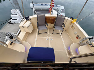 Stepping aboard the Motor Sailer 42 is most easily done through the cockpit due to the boat’s massive freeboard. For a boat of this size, the cockpit is fairly compact and utilitarian. Hull #1’s owners opted to forego built furniture in the cockpit other than one fold-down seat on the forward bulkhead and a small, varnished fold-up table aft. They brought out the ergonomic folding chairs they use instead from the gigantic storage lockers under the sole. Stowable chairs are a sensible choice in a rainy climate. Though fairly small, I’m certain the cockpit is still where the happiest hours of a cruise will be wiled away.