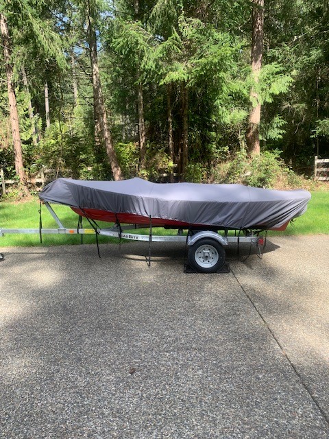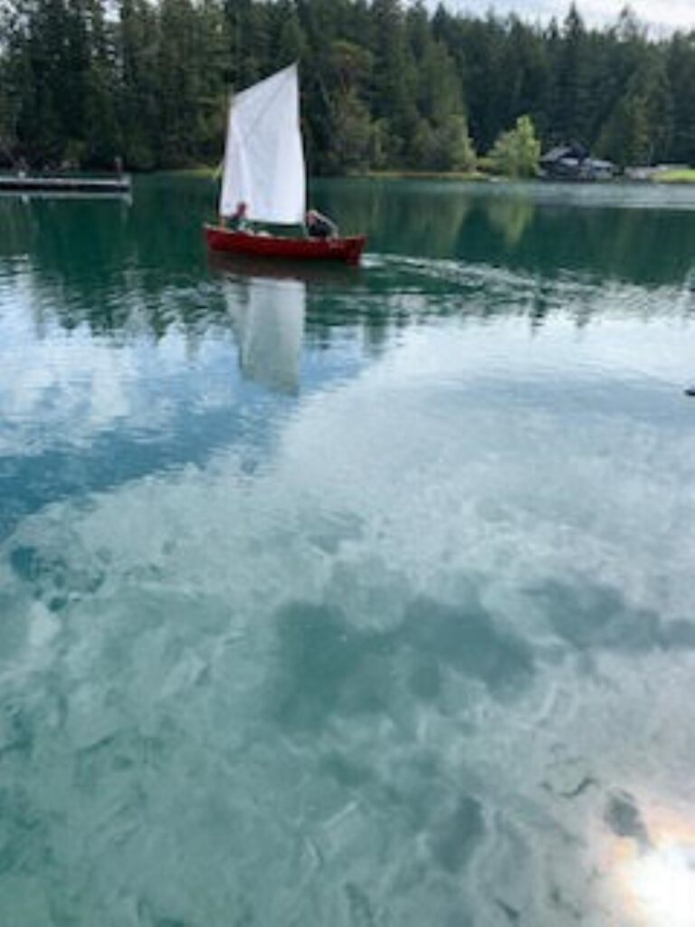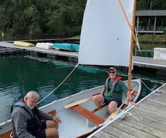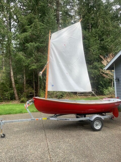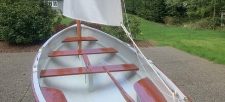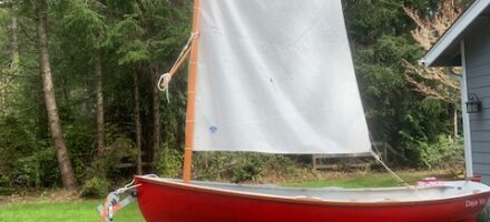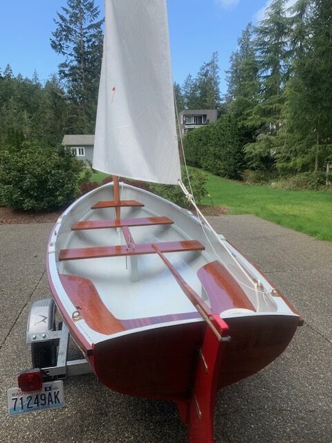 The original Catspaw Dinghy is a traditional planked boat designed by Joel White. Deja Vu is an adaptation to strip plank construction which consists of 1 X 1/2 inch yellow cedar strips edge glued together covered by fiberglass cloth. The transom and seating is constructed from Khaya. There is no internal frame for a very smooth, uncluttered interior. Another design change was to bring the sides of the rear seat forward to form side benches to sit on while sailing. Previous experience with sailing the Catspaw showed that the only place to sit while sailing was on the floor.. The builder constructed the traditional Catspaw many years ago and so has revisited building the boat – hence the name.