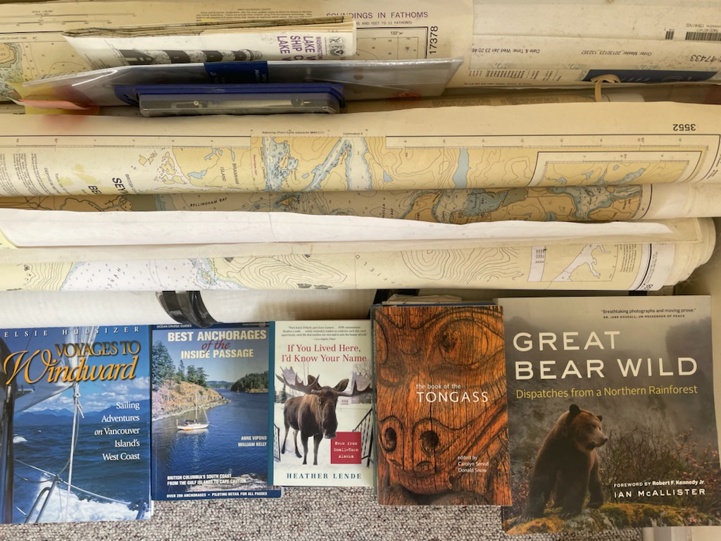 Complete set of charts between Olympia and Glacier Bay as well as so many books, anchorages, history, and interesting reading