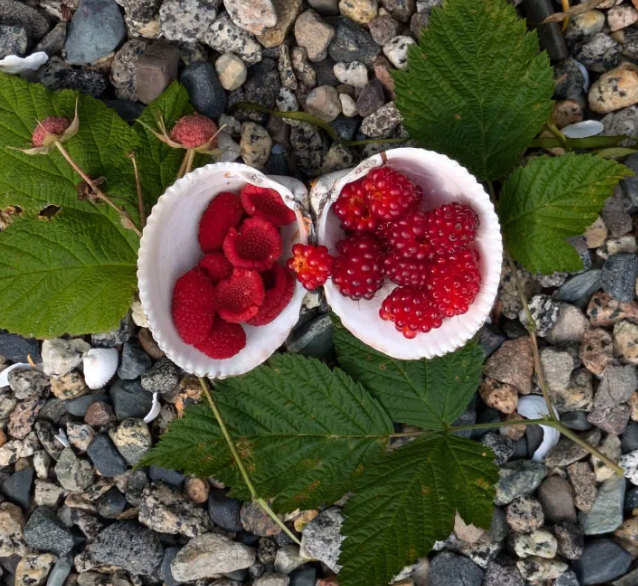 Large trees, a shady clearing and a pocket beach make it an excellent picnic spot. We picked salmonberries and raspberries for our breakfast and enjoyed a thoroughly unexpected and wonderful shore visit.