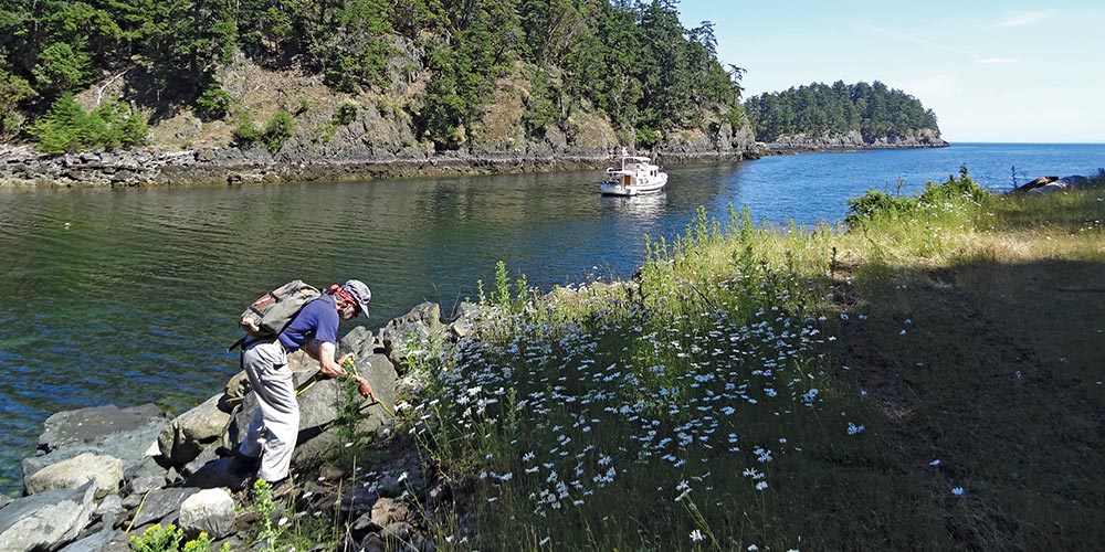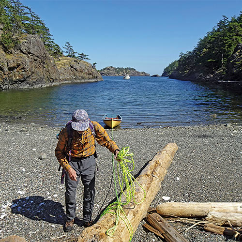 A short distance from Codfish Bay next to the “official” trail, oyster shells mark the junction with a faint track heading west up the hill. This is a boater-maintained trail that winds its way to the top of nearby Mt. Gibraltar, the highpoint of the island. It may only be 450 feet high, which is why it’s actually called Gibraltar Hill on some maps, but it is fairly open at the top and has commanding views of Sabine Channel and the Strait of Georgia to the south. In the summit cairn there’s a register you can sign. The trail can be faint in places and, near the bottom, it tends to splinter into several tracks, all of which lead to the official trail. The boater trail is short, only 1 mile round trip from the oyster shells, but we love the view and always have a sense of accomplishment from the climb.