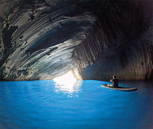 In Greece, we spent hours exploring limestone grottos. These sea caves are only accessible with a small boat. Once inside, the sunlight reflects off the sandy bottom, giving the water a blue glow.