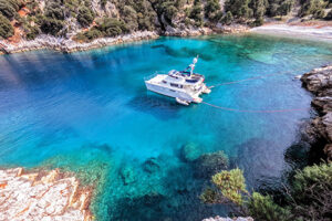 The Salish Sea was the perfect training ground for the Mediterranean. In many ways, a shore-tie is just the wilderness version of a Med-moor. Both require backing toward shore while dropping anchor and securing the stern to keep the boat from swinging. Whether you’re tying to an ancient quay in Greece, a busy marina in France or Italy, or a ring in a quiet British Columbia cove, the mechanics are the same. The only real difference is whether you’re stepping onto a concrete pier or paddling over to barnacle-covered rocks. The coast of Turkey is actually quite similar to the Salish Sea, with a steep and deep tree-covered shoreline, so we shore-tied quite frequently there.