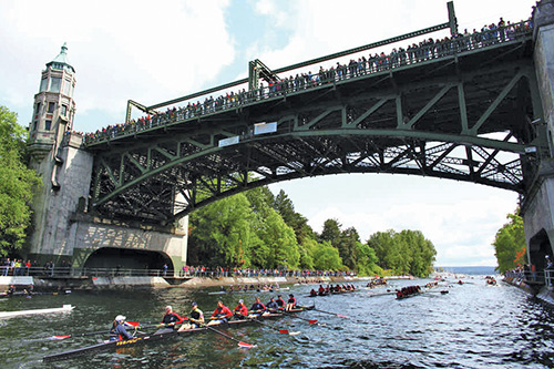 1987 was an especially dramatic year. Cold War tensions played out in the Lake Washington Ship Canal when the UW Huskies rowed against the Soviet Union’s national team, which won both the men’s and women’s races. At the end, Soviet and UW crews exchanged jerseys and rowed back together, beginning a tradition of camaraderie that still characterizes the event. In 2001, several members of the Romanian women’s crew defected to the United States, further attracting international attention to the regatta. The UW has continued to maintain a strong rowing program, hosting teams from China, Italy, Germany, Great Britain, New Zealand, Australia, and other nations. As is customary, a decorated boat parade will once again follow the Windermere Cup through the Montlake Cut this year, starting the fanfare with a cannon blast and the raising of the bridge.