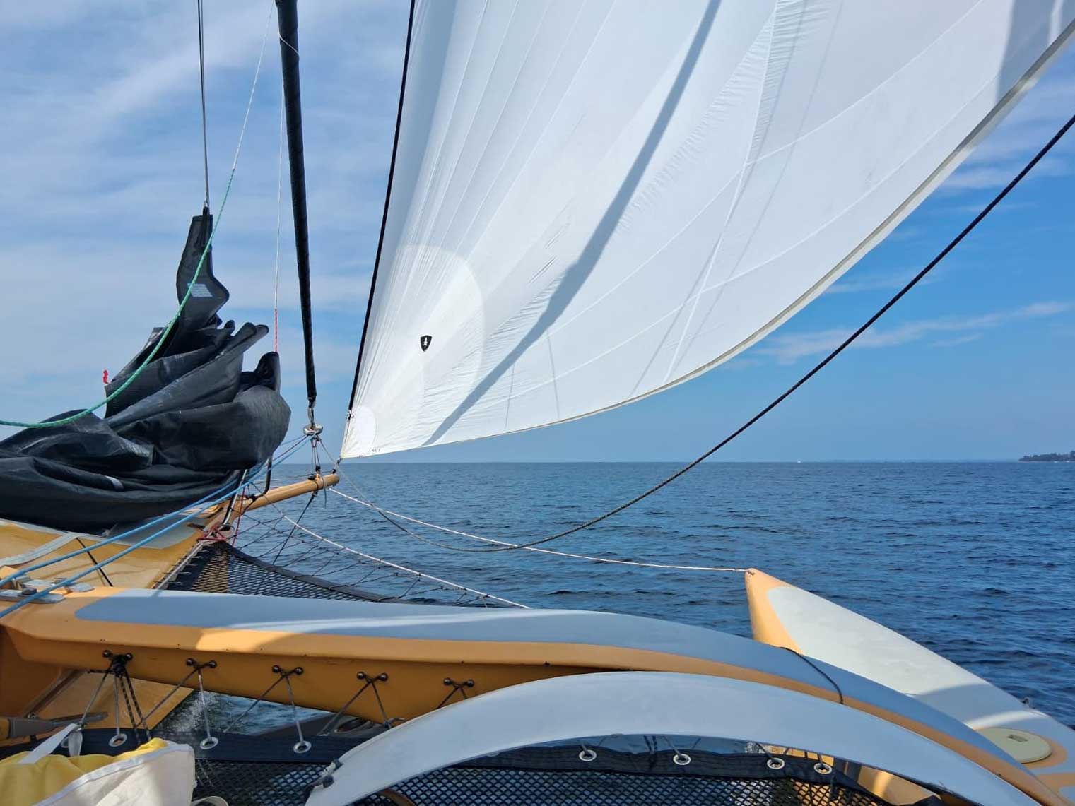 Waiting for the next breeze, we played a light northerly and made our way toward the banks. We got a shift and headed north again, but Mist was closing in. Still, we found some new breeze and started making progress. By now, there was barely any wind, but we still had 8 knots of boat speed. As evening descended and the mark loomed closer, we decided to enjoy our provisions—Chipotle burritos—before rounding the mark and heading south. Just before the mark, the wind shifted southwest, and we had a quick kite run for the last couple of miles.