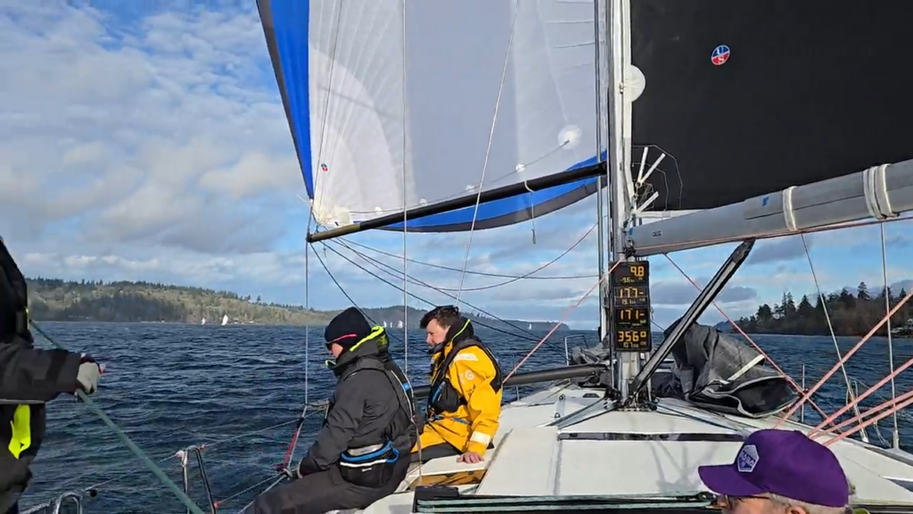 We have been racing the Winter Vashon since the late 1980s, first on our S2 9.1 Chinook and now on our Jeanneau SO 519 Equus—we’ve been on the start line north of 30 times. In that history are memories of pea soup fog, playing cards at the TYC dock waiting for the abandonment signal, and drifting slowly north for hours in Colvos Passage. Fortunately, Winter Vashon usually offers a high probability of exciting and challenging conditions. Without a doubt, it has become our favorite race of the season, and 2025 was a great edition.